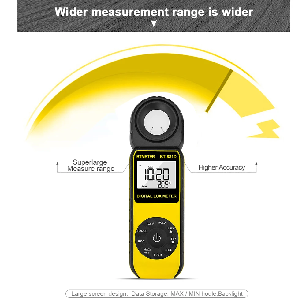 ● 【Разрешение: 0.1Lux/0.01Fc; Скорость измерения: 2 раза/сек. ● 【Широкий Диапазон измерений: 0,1-400,000Lux/1-40,000FC, светильник для растений, кинотеатров, школ, станций, офисов и других мест, требующий тестирования. ● 【Высокая точность 】 ± 4% rdg ± 0.5% f.s (менее 10000 люкс; 1000 FC) / ± 5% rdg ± 10dgt (более 10000 люкс; 1,000FC) с ЖК-подсветкой. Датчик люкс-метра может вращаться на 270 градусов, поэтому вам не нужно перемещать люкс-метр, просто нужно повернуть lux meteer. ● 【Многофункциональное 】 быстрое реагирование, автоматическое обнуление, хранение данных и пиковые переключатели удержания данных, низкое энергопотребление, короткое время подъема и падения, с ЖК-подсветкой.