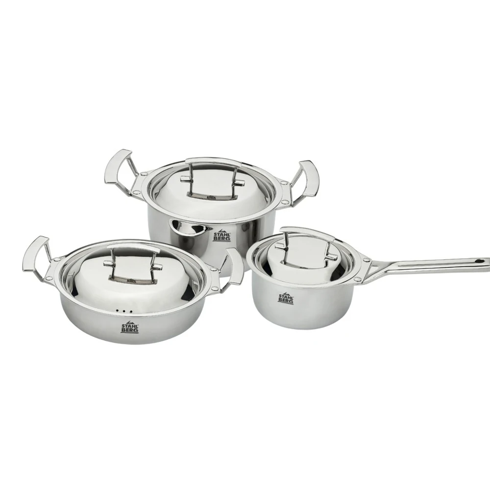 Каждый из предметов набора имеет 3-слойный корпус из нержавеющей стали, что гарантирует вам прочность и долгий срок службы посуды.