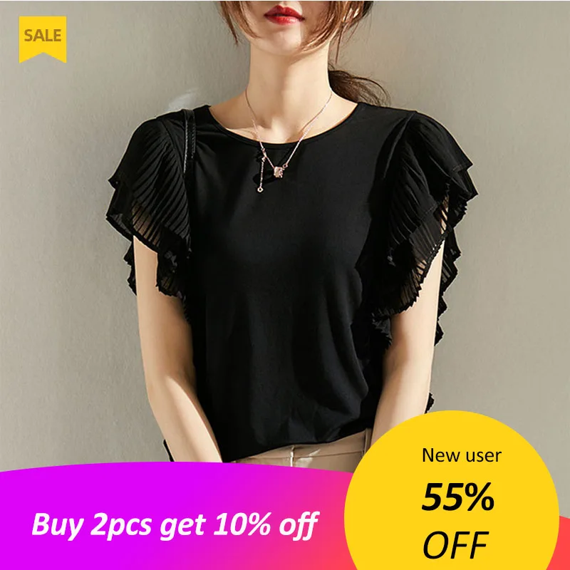 2020 плиссированная Блузка с оборками, женская летняя Корейская рубашка черного цвета, женские тонкие стильные блузки с круглым вырезом и двойными рукавами, женские топыКупить сейчас