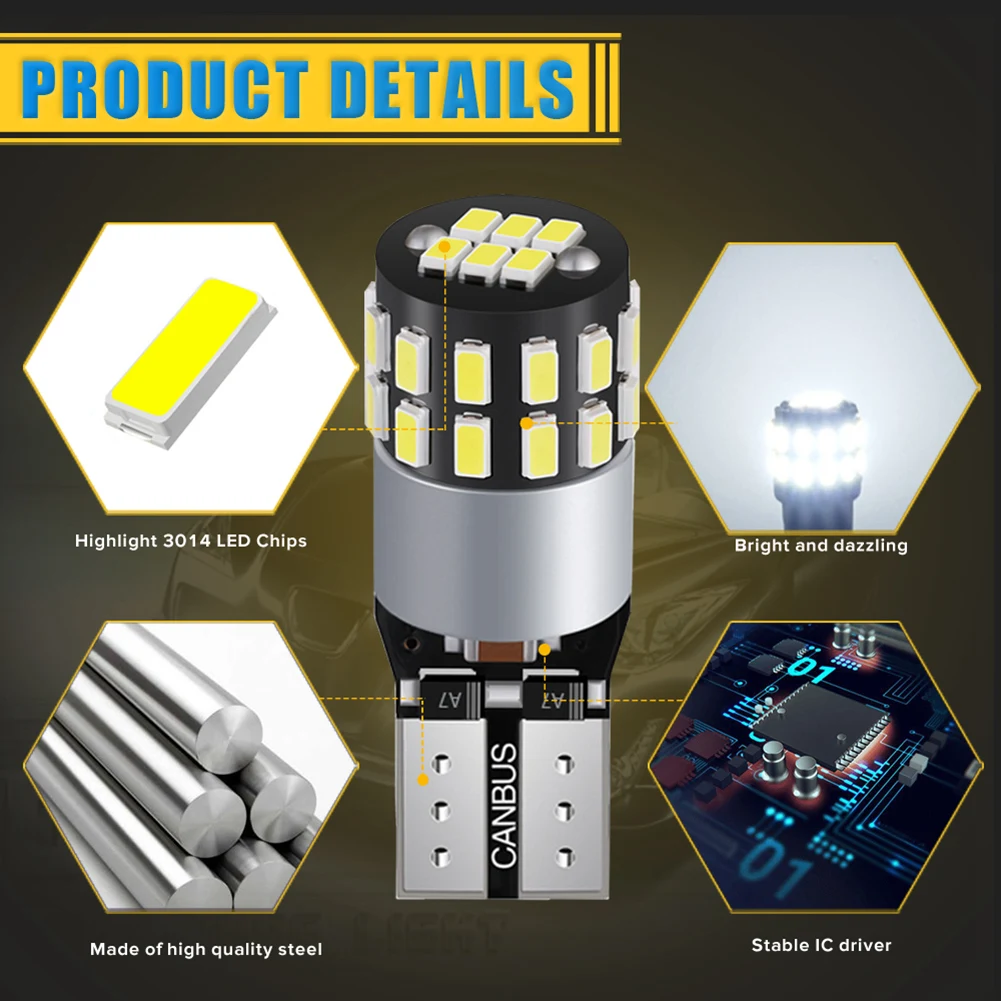 1. Светодиодный Тип: 3014 SMD (количество 30 светодиодный s) 2. Светодиодный Цвет: 6000K белый 3. Угол луча: 360 градусов 4. Рабочее напряжение: 12 В 5. Люмены: 750лм 6. Светодиодный чип на плате) Срок службы: 60000 часов 7. Тип: светодиодный светильник для замены 8. Характеристики: Canbus, без ошибок, без ошибок