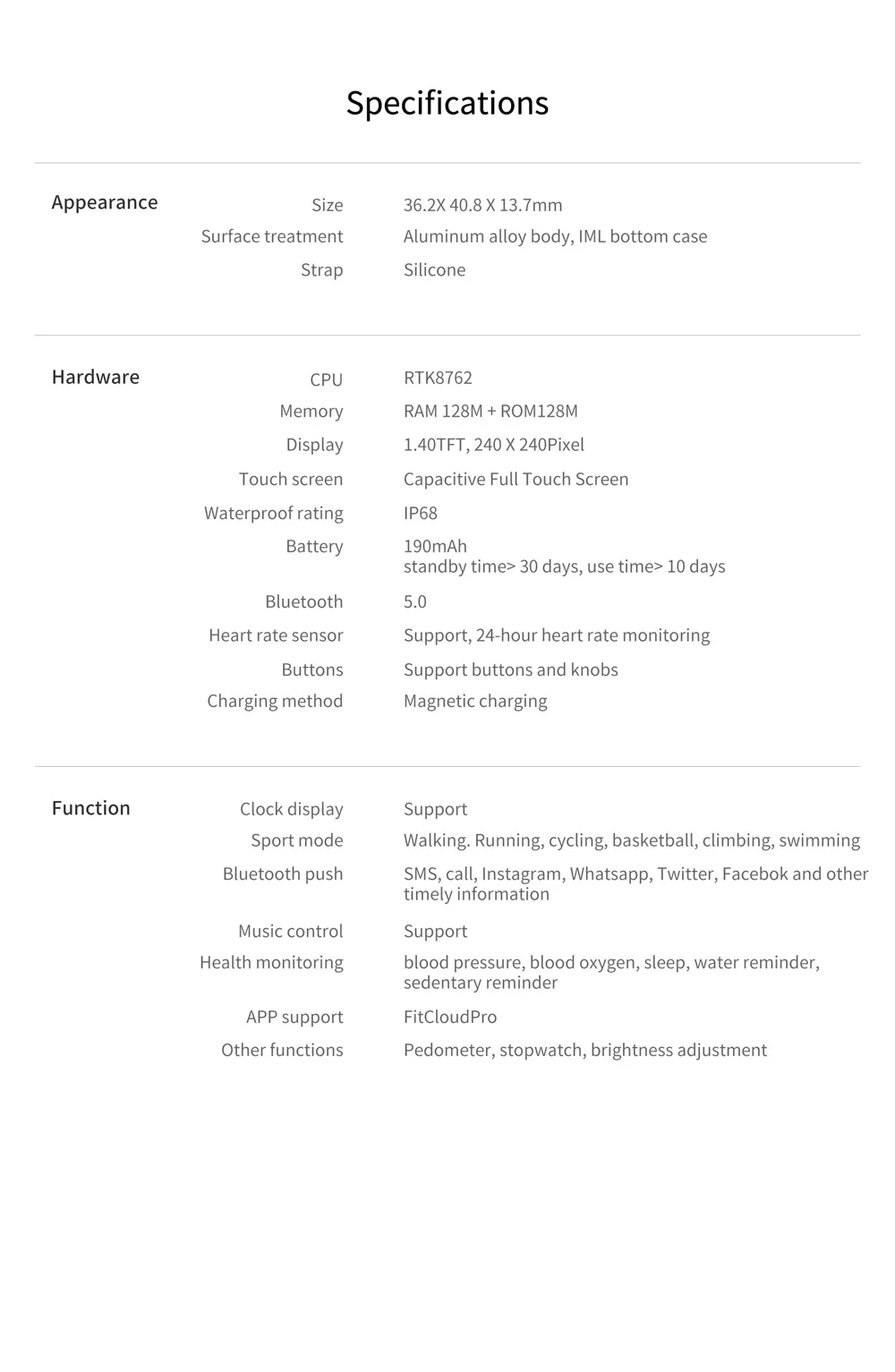 1. Класс водонепроницаемости IP68, пригоден для плавания 2. 24-часовой непрерывный мониторинг сердечного ритма 3. Панель 3D arc, экран ультра-высокой четкости и соотношение экрана, лучший визуальный опыт 4. Свободный выбор стиля с несколькими циферблатами 5. Корпус из авиационного алюминия, легкий и не выцветает 6. Поддержка кнопок функции и вспомогательная отладка сенсорного экрана 7, 2 варианта меню являются дополнительными 8. Разноцветный ремешок 9. Емкость аккумулятора: 190 мАч, нормальное рабочее время до 7 дней, до 30 дней