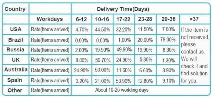 Все товары будут доставлены в течение 3-5 рабочих дней. Авиапочтой: 15-20 дней в Азию, Европу, Северную Америку По DHL, UPS, FedEx: 3-5 рабочих дней в большинство стран