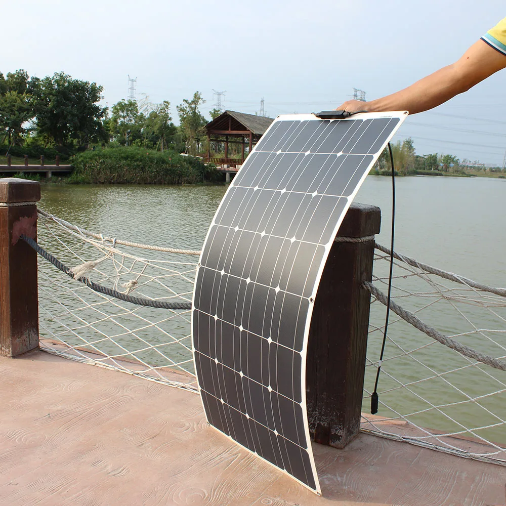 Пластиковая Задняя панель из 100 Вт гибкой солнечной панели может быть согнута до 30 градусов и может быть легко установлена на крыше, автомобиле, лодке, каюте, палатке или любой другой неровной поверхности.
