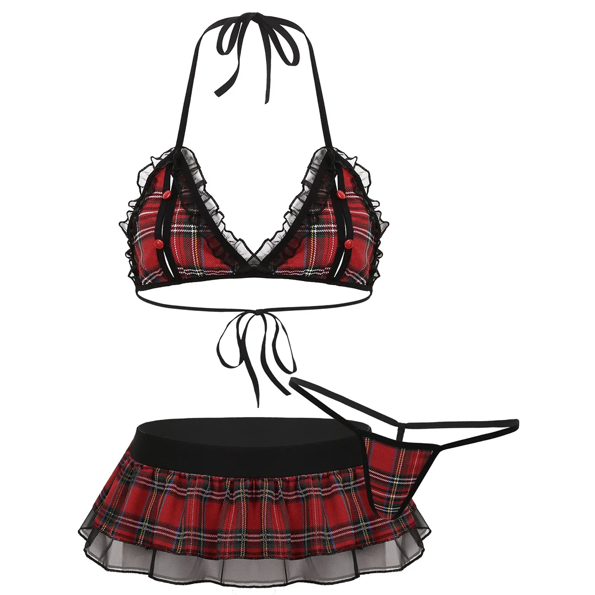 Клетчатый дизайн, горловина через шею, прорези для сосков с красными пуговицами, топ с бюстгальтером, можно регулировать по размеру.