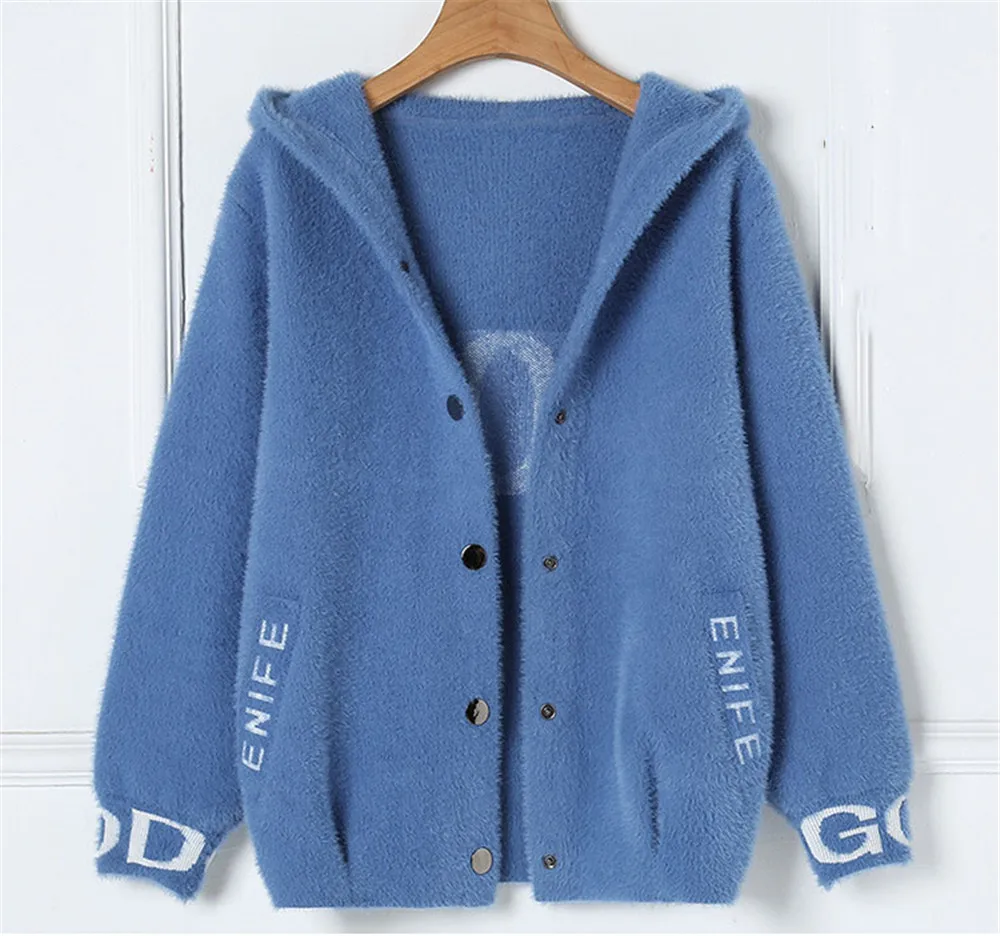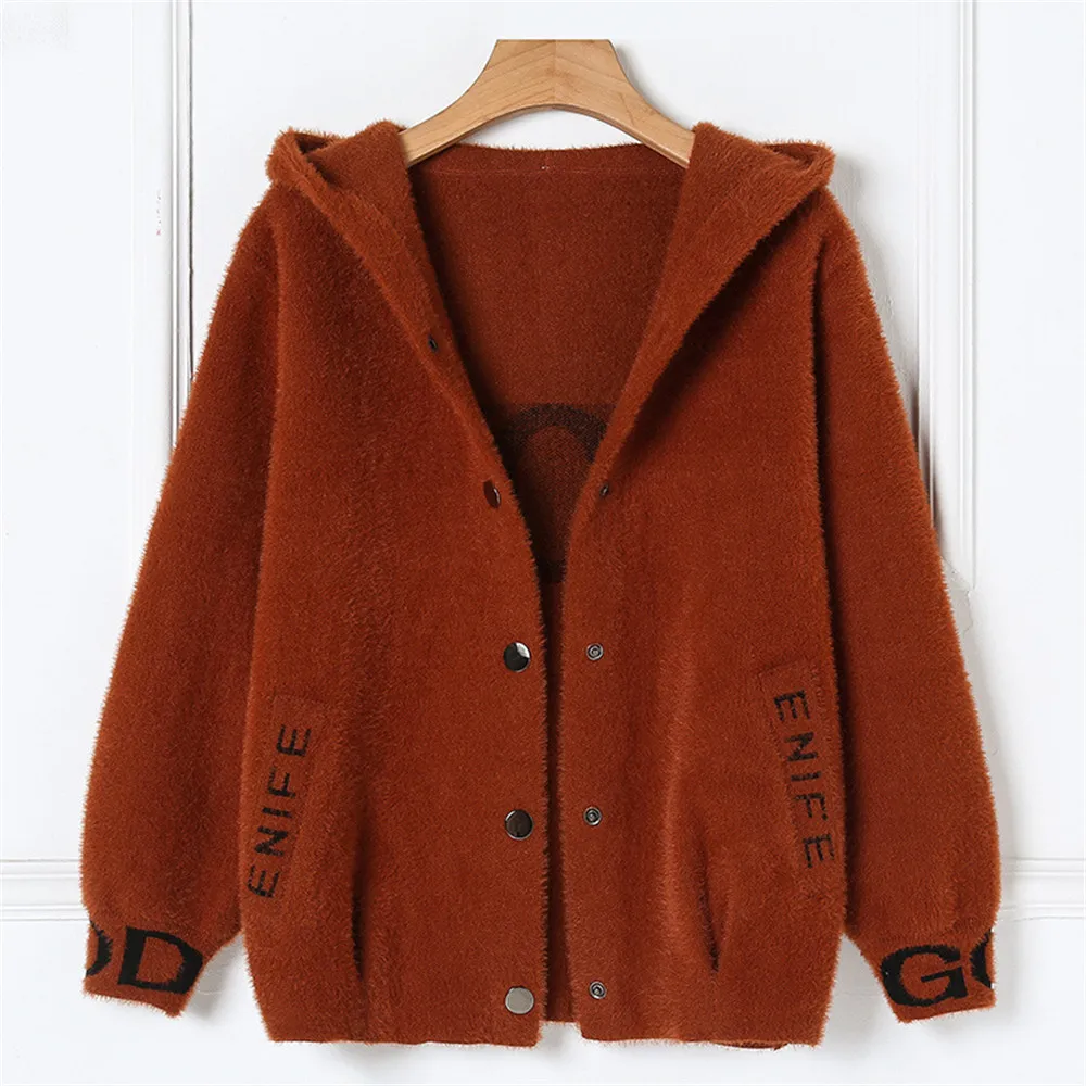 Высококачественный однобортный Кардиган из искусственного меха норки с капюшоном и буквенным принтом, толстый теплый зимний женский свитер, пальто