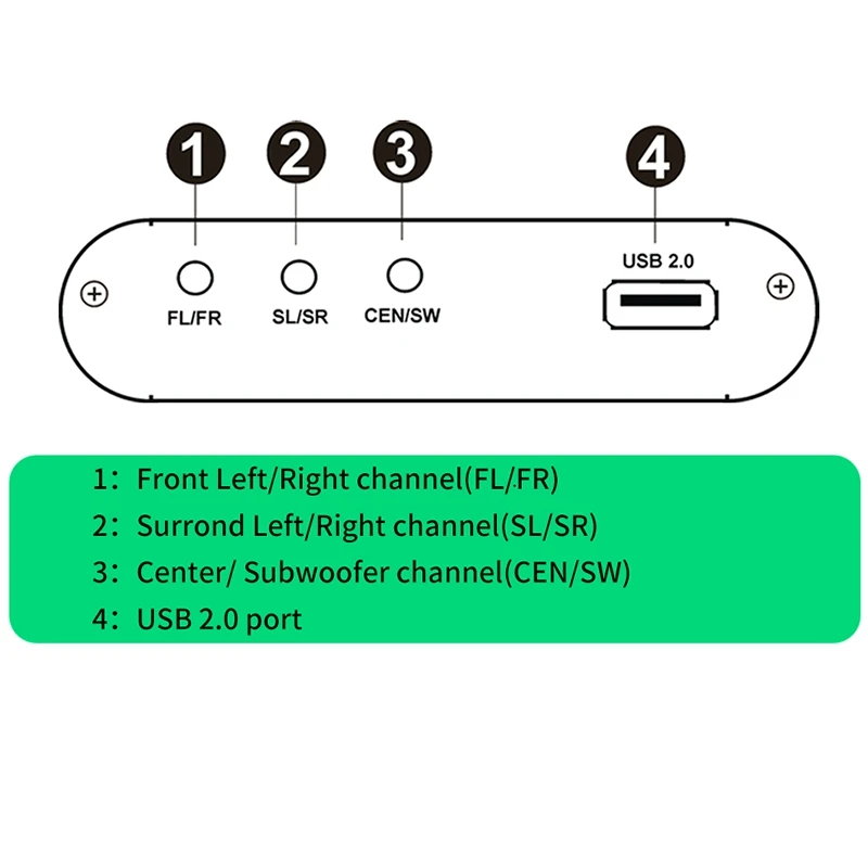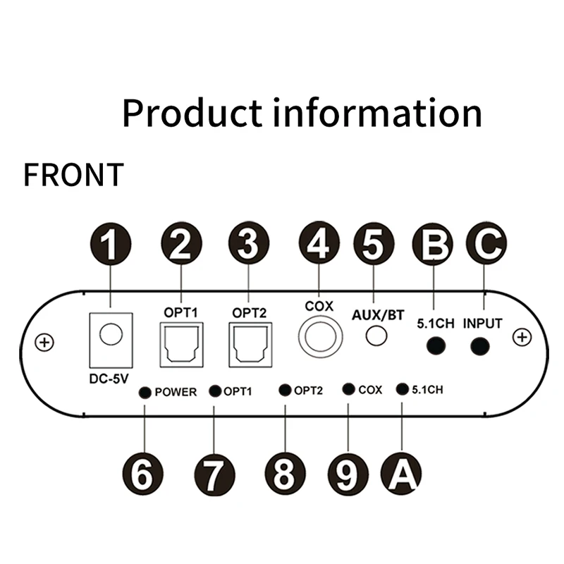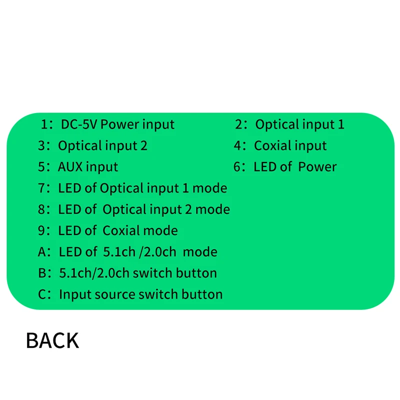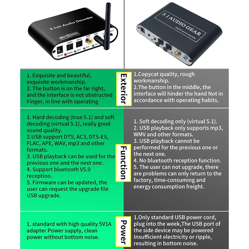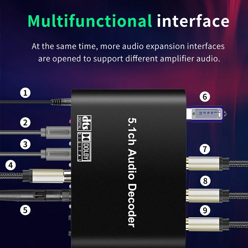 1: Поддержка двух оптических входов, один коаксиальный вход, вход Bluetooth 5,0, один вход USB 2,0. Вы можете переключать различные источники сигнала по Button.2: поддерживает один аналог 5,1ch o на разъем 3,5 мм для телефона 3: o farmat поддержка FLAC, APE, DTS, AC3, WAV, HDCD, DSD, AAC, WMV, MP3, M4A etc.4: Поддержка режима вывода 5.1ch / 2.0ch, FL / FR активный, когда 2.0ch выходной режим.