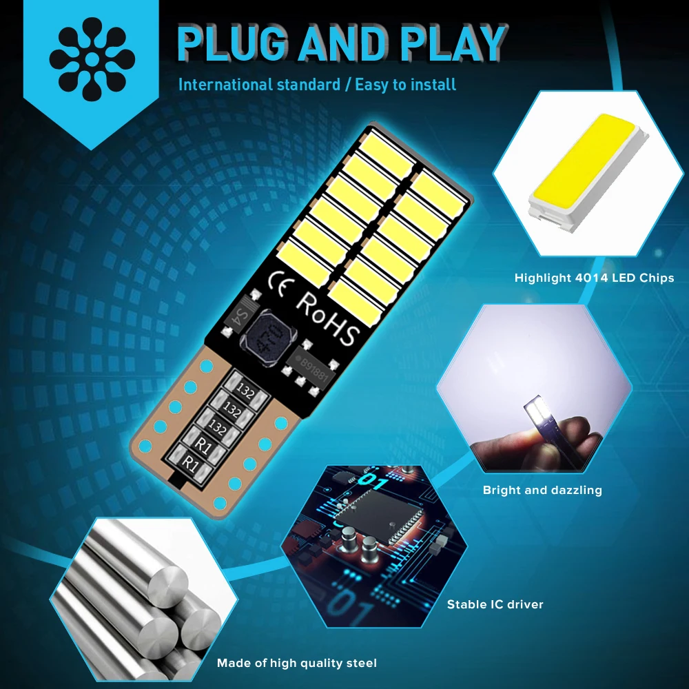 Основание: T10 led (W5W/194) Чип-светильник: ультра яркий 24 * 4014SMD Рабочее напряжение: 12 В постоянного тока Светодиодный Цвет: белый T10 led,W5W, 192168152158159161184 и т. Д. Супер яркий с 4014 светодиодный Алюминиевый Чехол для лучшего рассеивания тепла