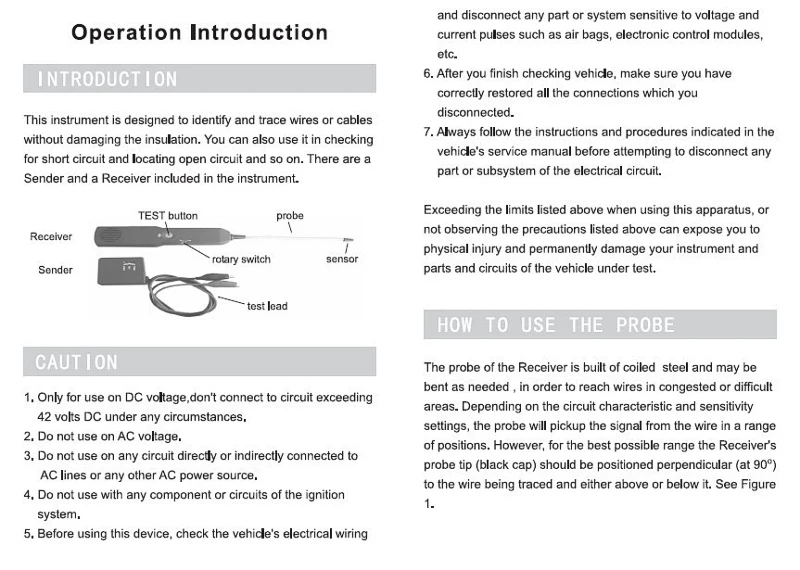 Простота в использовании: Просто подключите передатчик в серии с цепи или провода под тестом, (i. Е.: в месте выдувного предохранителя, через соединитель, в серии с открытым проводом, светильник с гнездом лампы и т. д.), И сканирование цепи/провода с помощью гибкого зонда для отслеживания неисправности