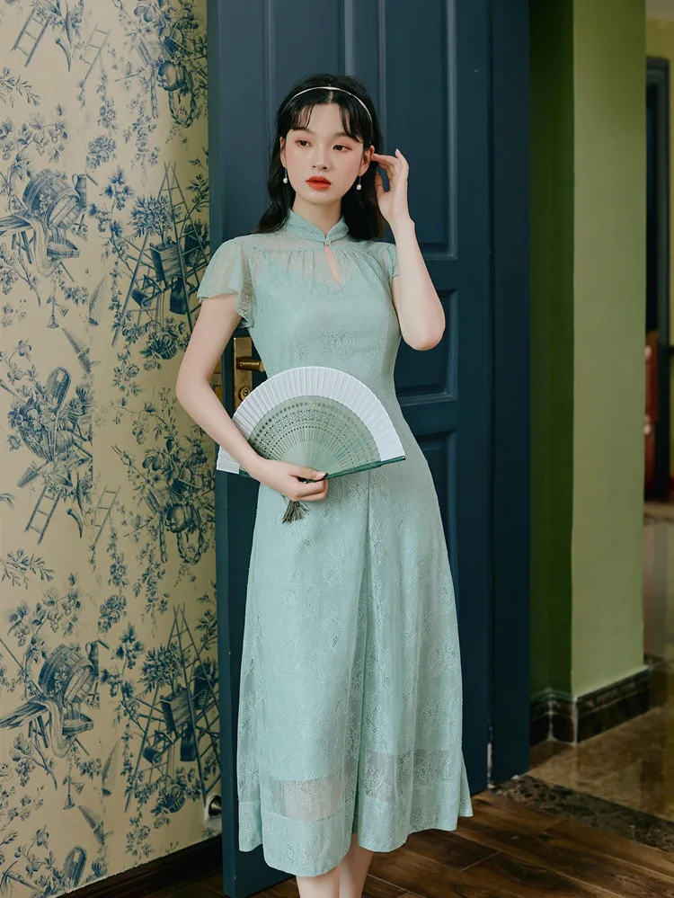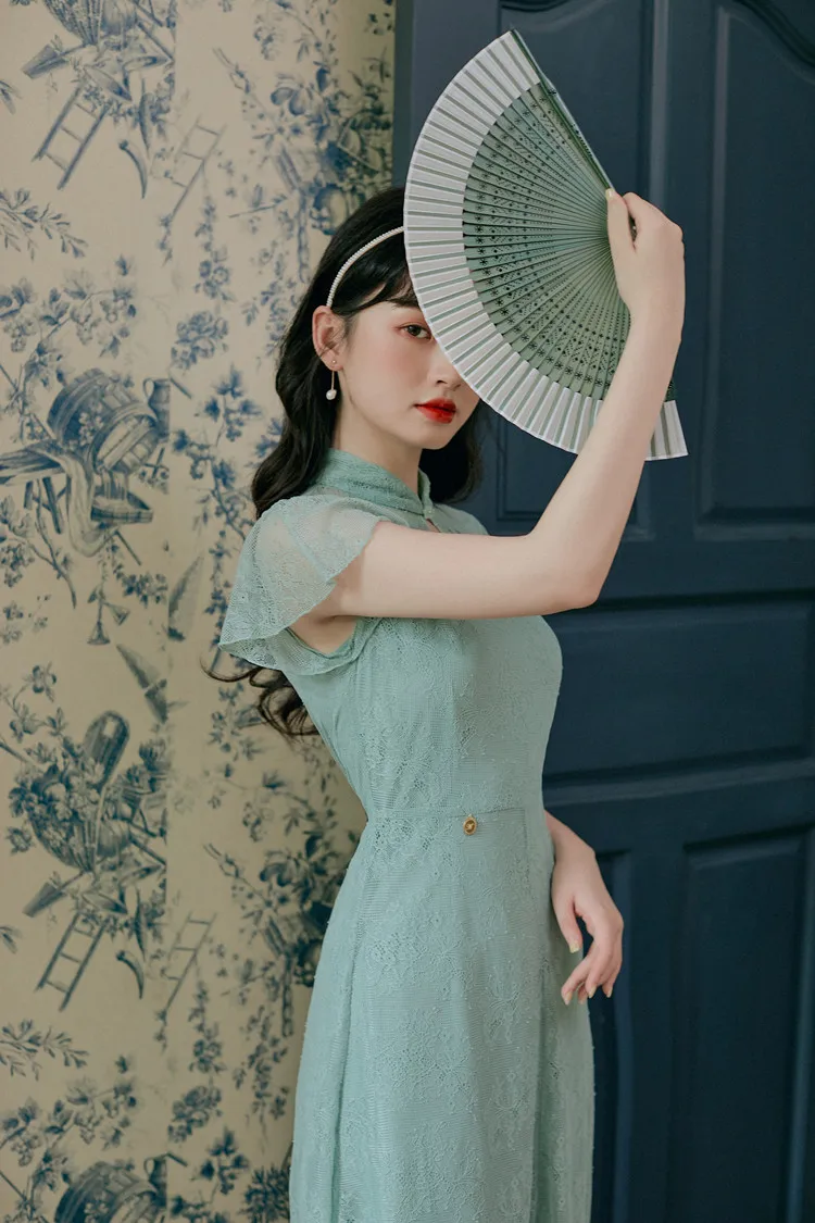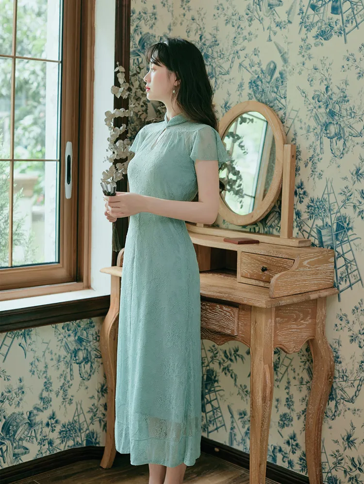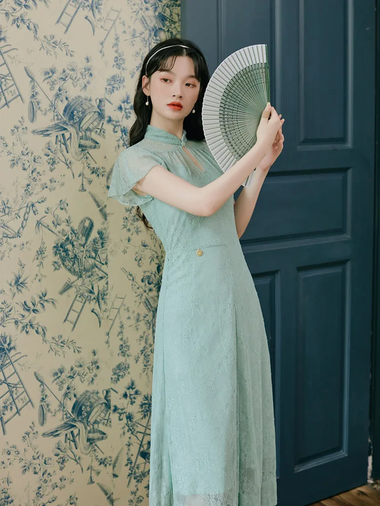 Длинное платье Ципао цвета шампанского с v-образным вырезом и блестками