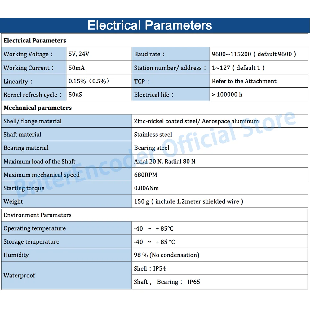 Характеристики продукта: • Корпус промышленного стандарта, наружный диаметр Φ50 мм • Выходной вал из нержавеющей стали 8 мм • Линейность: 0.1% • Выход RS485, стандартный протокол Modbus • Разрешение поворота: 1024 (10 бит), 4096 (12 бит) • Питание-вниз память о количестве поворотов (не требуется аккумулятор) • Стандартный 1 ~ 1,5 м Высокое качество экранированный провод сигнала, (в том случае, если вам нужно, чтобы продлить его, пожалуйста, проконсультируйтесь с нами, пожалуйста Имейте это в виду при размещении заказа.) • Максимальная Механическая скорость: 1000 об/мин; • Тип выхода: Боковая розетка. Преимущества: Полномасштабный кодировщик, состоящий из точного редуктора, не требует подсчета, аккумулятора и отключения памяти; Любое положение в пределах диапазона уникально, И даже если есть помехи или отключение питания, количество поворотов не будет потеряно. Применение областях: Абсолютный роторный кодировщик может использоваться для измерения скорости, угла и ускорения объекта, а также измерения длины. Этот датчик угла вала подходит для различных интеллектуальных измерений смещения, автоматического выключателя бумаги фиксированной длины, управления длиной резки стальной пластины, гражданского измерения высоты человеческое тело, весы, студенческий гоночный робот. Широко используется в сталелитейной промышленности, текстильной технике, портовом оборудовании, пластиковом оборудовании, подъемном оборудовании, напорном оборудовании, стеклянном оборудовании, печатном оборудовании, деревянном оборудовании, упаковочном оборудовании, машинном оборудовании, логистическом оборудовании, шинное оборудование, электроника, солнечная энергия, лифты, цементные заводы, роботы, Струйные принтеры, AGV автомобили.
