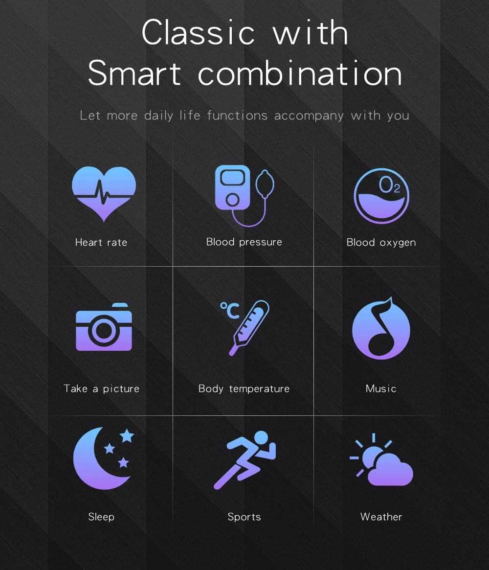 * 24 часа непрерывного обнаружения пульса, контроля артериального давления, теста сна * Отображение времени/часов, шагов, калорий, расстояния, сна, камеры * Управление музыкой (вверх и вниз, воспроизведение и пауза) * Женский менструального цикла Мониторинг сна (время сна, качество сна) * Напоминания о звонках, SMS напоминание, qq напоминание, Wechat и другое напоминание приложения. * Спортивный режим: уличная бег, уличная ходьба, Крытый бег, крытая ходьба, Пешие прогулки, Шаговая машина, уличная езда, крытая езда, эллиптическая машина, гребная машина * Будильник, секундомер, обратный отсчет, напоминание о сидячем положении, поиск браслета, поворот запястья * Камера дистанционного управления (встряхните, чтобы сделать фотографии)