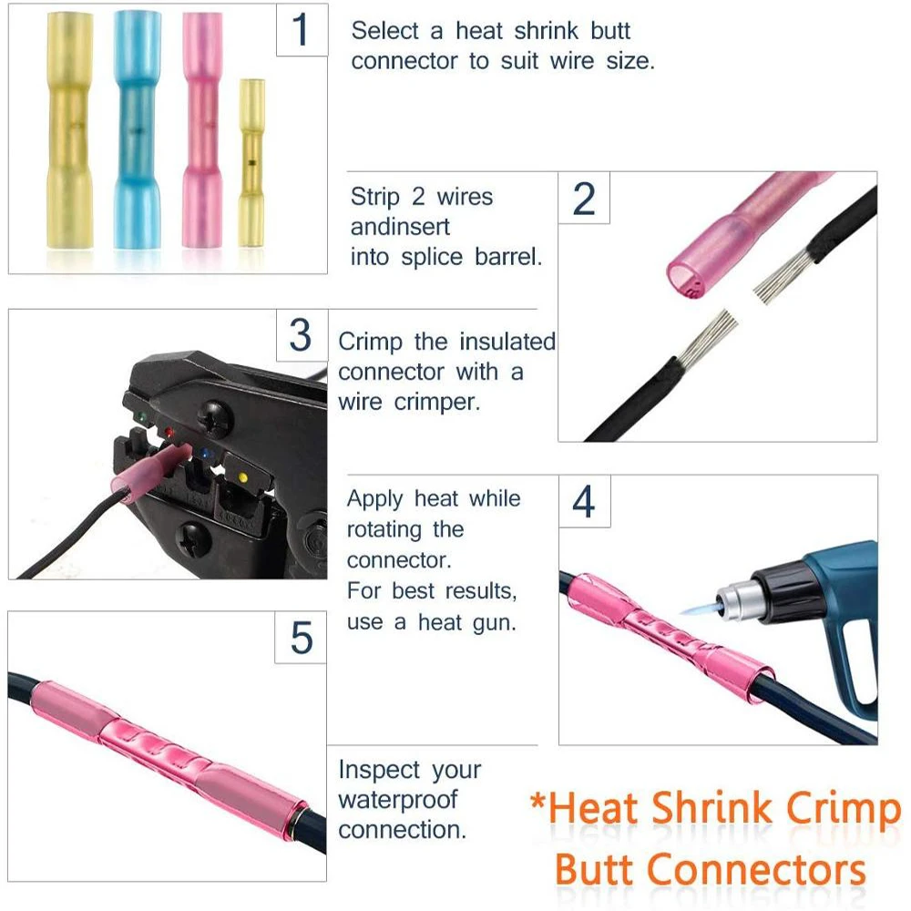 -Гарантированно удерживает сильные криперы. -Стандартный обжим, а затем уплотнение термоусадочных соединителей. -Обеспечивает визуальный осмотр, предотвращает коррозию и обеспечивает водонепроницаемое уплотнение. -Чтобы получить наилучшие результаты, используйте пистолет горячего воздуха, пока он не уменьшит размер и поток клея, наполняя отверстия внутри терминала.