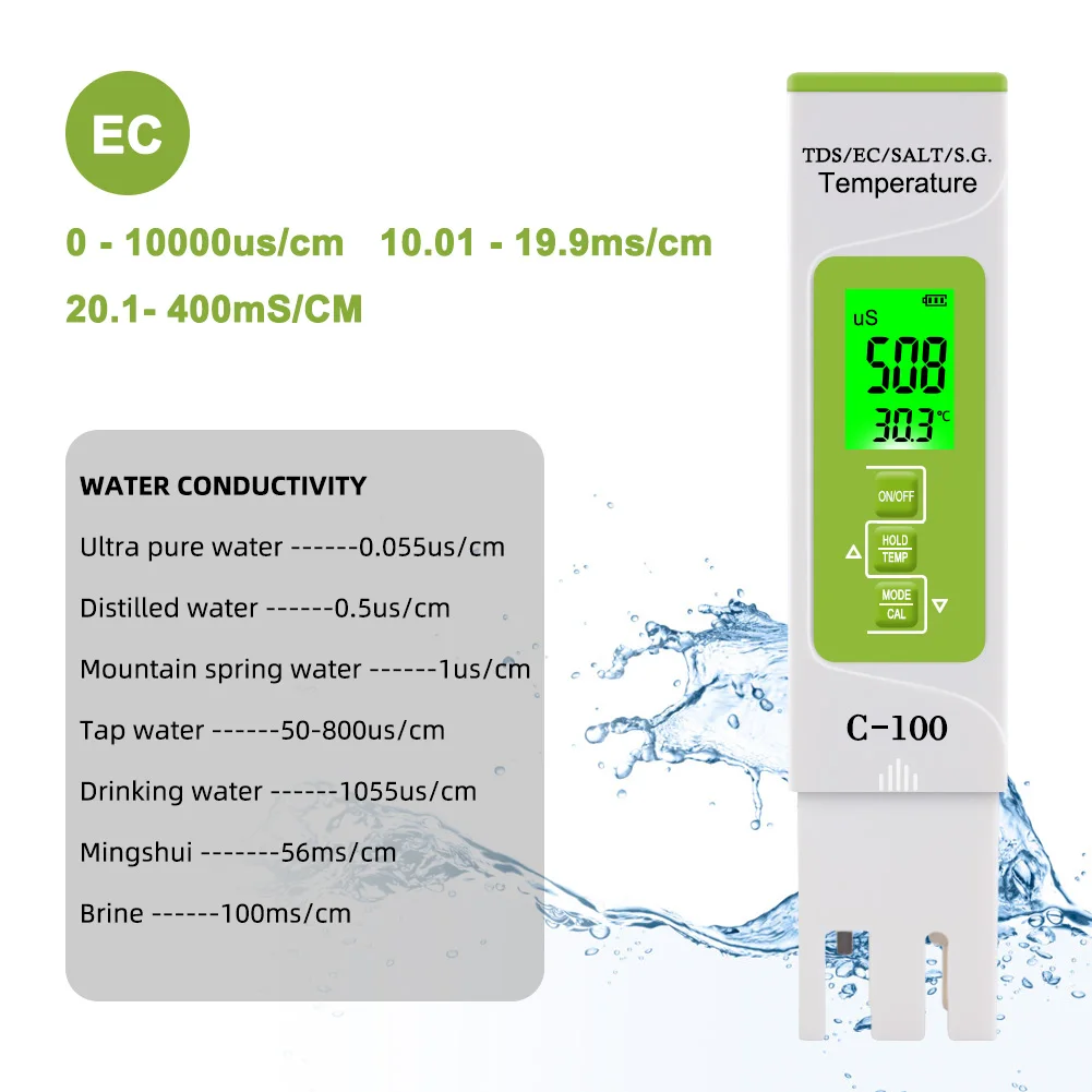 Может измерять TDS, EC, значение солености S.G и температуру. Диапазон измерений большой, и он может измерять как соленость пресной воды, так и морскую соль одновременно. Это удивительный цифровой монитор качества воды, подходит для домов, бассейнов, питьевой воды, горячих источников, домашних кухонь, лабораторий, ферм, аквариумов, пищевой промышленности, аквакультуры, баз аквакультуры, И т. Д.