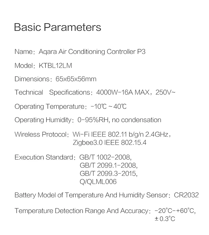 Размер продукта: приемник кондиционера 65 × 65 × 56 мм; Датчик температуры и влажности 36 × 36 × 9 мм