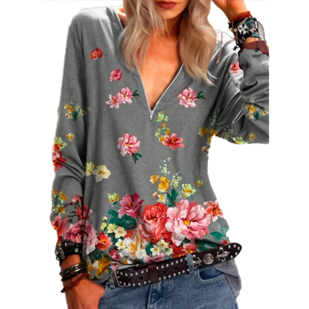 Женская футболка с цветочным принтом, на молнии, с v-образным вырезом, футболка с длинным рукавом, женская одежда, осенне-весенние пуловеры, повседневный Топ для женщинUS $14,99 /