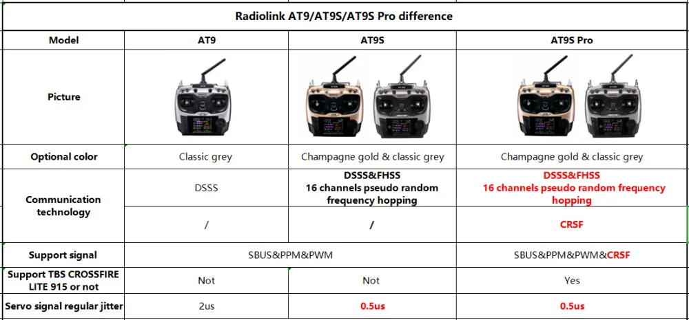 Характеристики передатчика AT9S: Каналы: 10ch/12chРежим: Режим 1 или режим 2Сигнал: SBUS/PWM/PPM/CRSFЧастота: диапазоны ISM 2,4 ГГц (от 2400 МГц до 2483,5 МГц)Ширина полосы канала: 5,0 МГцСпектр распространения: DSSS и FHSS/CRSFРежим модуляции: QPSKОтторжение прилегающего канала: >38dbmМощность передачи:DSSS & FHSS <100 мВт (20dbm)CRSF: 10 мВт/25 МВт/100 мВт/500 МВт/1 Вт/2 Вт (опционально)Рабочий ток: DSSS и FHSS < 90mA @ 12VCRSF зависит от выбора мощности передачиРабочее напряжение: 7,4 ~ 18,0 в4096 точность сеченияЭкран: 2,8 дюйма 16 цветов, 240*320 пикселейКанал: 12 каналов, 5-12 каналов настроеныРазмер: AT9S Pro 183*100*193 ммВес: 0,88 кгДиапазон управления: 4 километра в воздухе (максимальный диапазон тестируется в свободной зоне без помех)Совместимые приемники:12CH - R12DSM, R12DS,10CH- R9DS, R6DS,R6DSMПротокол CRSF: приемник от BLACKSHEEP