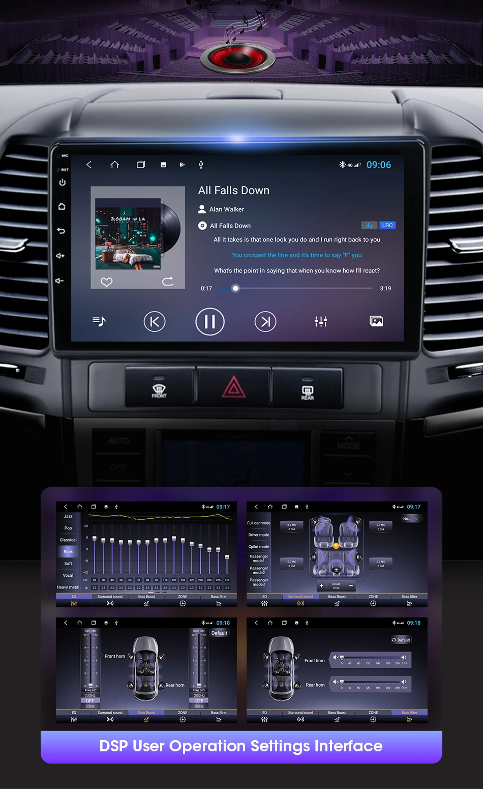 Радио использует 2.5D IPS Мультитач емкостный экран, который полностью отображает богатые цвета, в то время как нежный светильник, излучаемый из 2.5D экран не раздражает глаза. Поддержка раздельного экрана любых 2 приложений, сочетающихся по желанию.