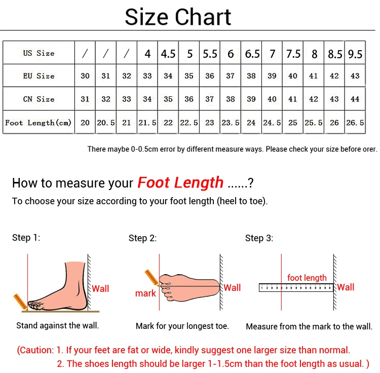 1. Размер обуви-это китайский размер, пожалуйста, обратитесь к таблице ниже, чтобы выбрать размер 2. Измерьте длину вашей стопы, от пятки до носка, очень важно 3. Выберите подходящий размер США в зависимости от длины стопы. Например, если длина вашей стопы 23 см, выберите размер 6. 4. Если у вас есть какие-либо проблемы, пожалуйста, дайте мне знать! 5. Если вы хотите оптовую продажу обуви, пожалуйста, свяжитесь с нами, мы предоставим вам цену со скидкой и быстрый способ доставки.