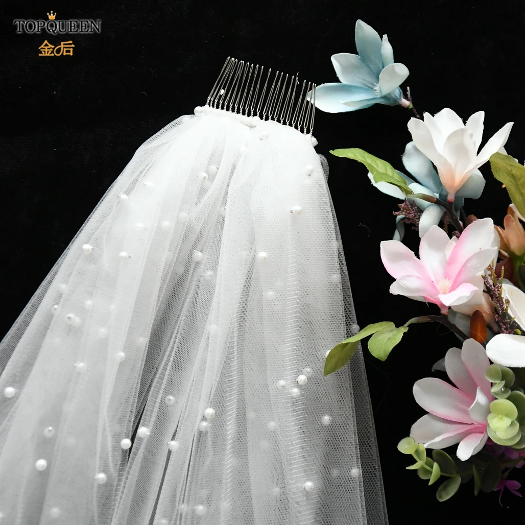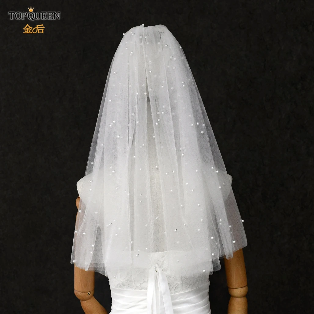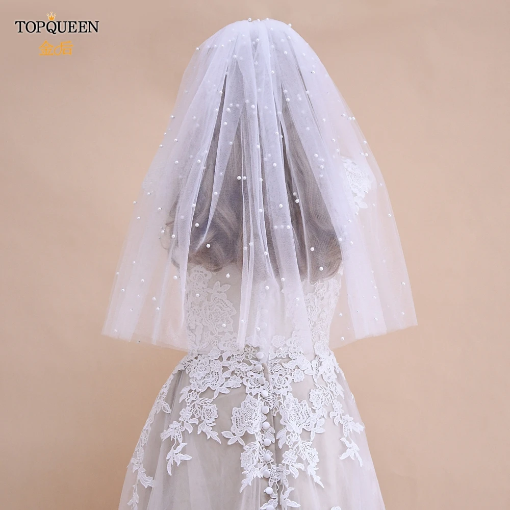 TOPQUEEN V07 короткая белая свадебная вуаль цвета слоновой кости с жемчугом, тюль с гребнем для волос, двухслойная свадебная вуаль для свадебного банкета
