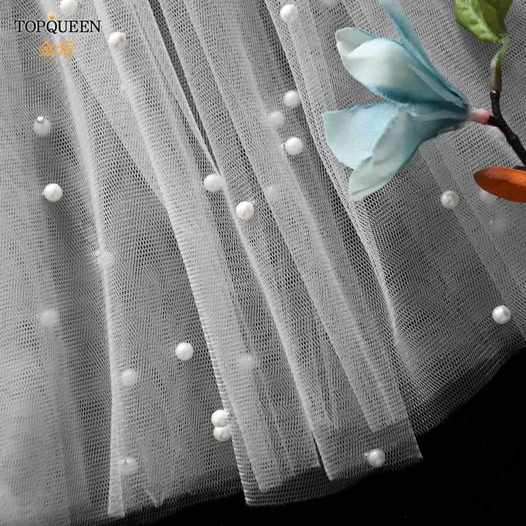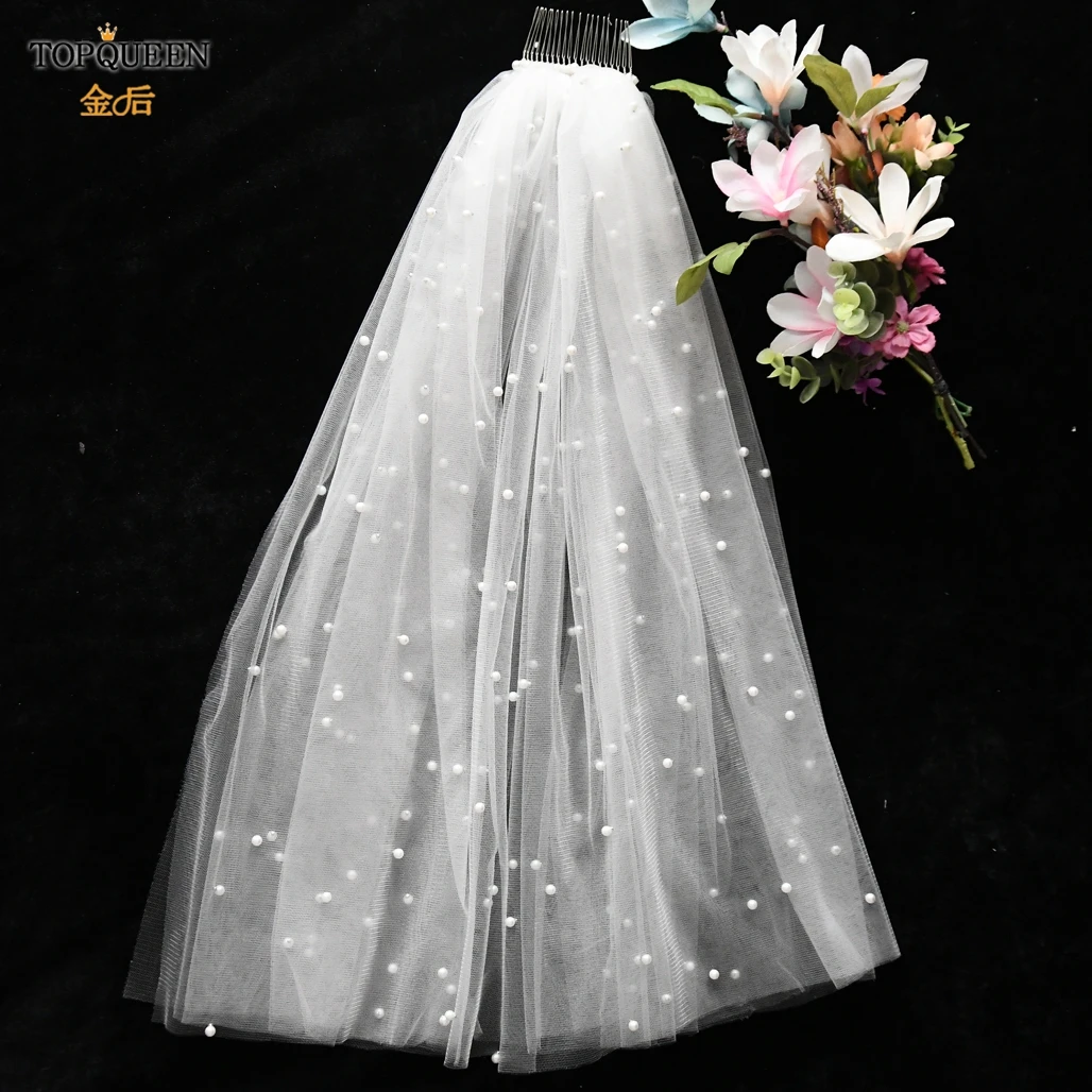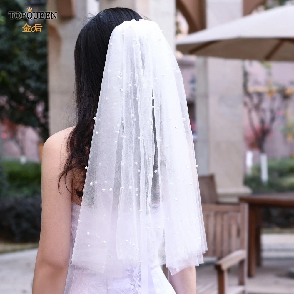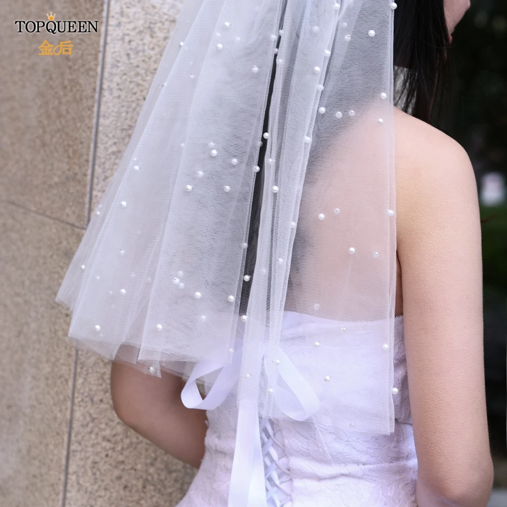 TOPQUEEN V07 короткая белая свадебная вуаль цвета слоновой кости с жемчугом, тюль с гребнем для волос, двухслойная свадебная вуаль для свадебного банкета