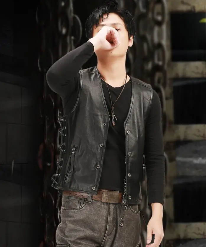 Мужской жилет из натуральной кожи BONJEAN, Байкерский жилет с металлической цепочкой, мотоциклетные куртки без рукавов из натуральной кожи с регулируемой завязкой