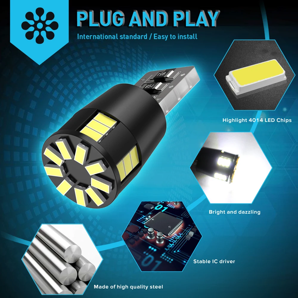 Розетка: T10 W5W 194 168 2825 Люмены: 750лм/лампа Мощность: 3 Вт Рабочее напряжение: 9-18 В постоянного тока Цветовая температура: 6000 К белый, красный, желтый, голубой Светодиодный набор микросхем: 24 3014 SMD Пункт продажи: без ошибок, стильный внешний вид Применение: Световые индикаторы ширины, потолочные светильники, лампы для чтения, огни багажника, зеркальные огни заднего вида, парковочные огни, боковые габаритные огни, дверные огни, номерные знаки, Внутренние огни, люминесцентные огни и т. д.
