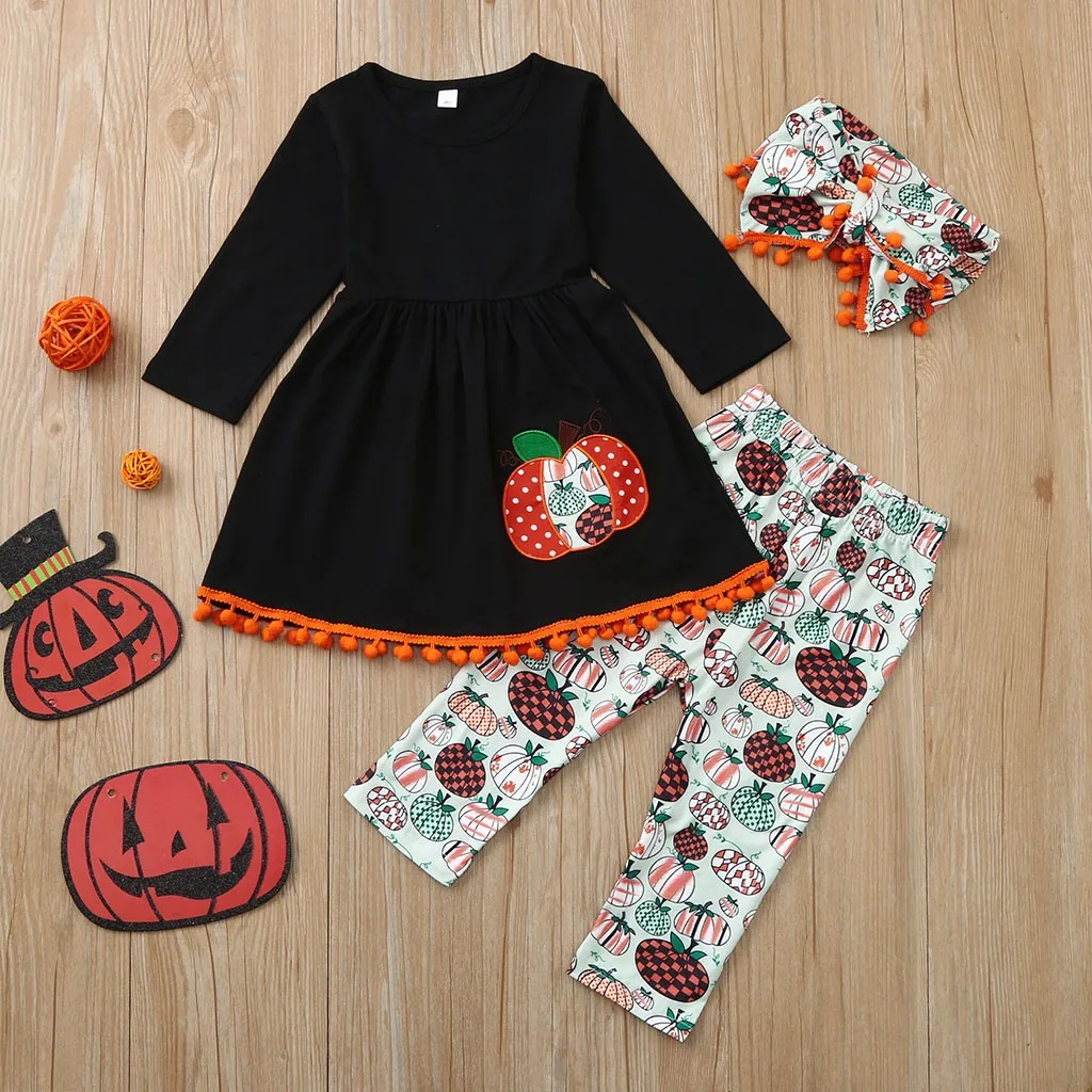 Детский топ с длинными рукавами и принтом тыквы на Хэллоуин для девочек, платье + штаны + повязка на голову, комплект