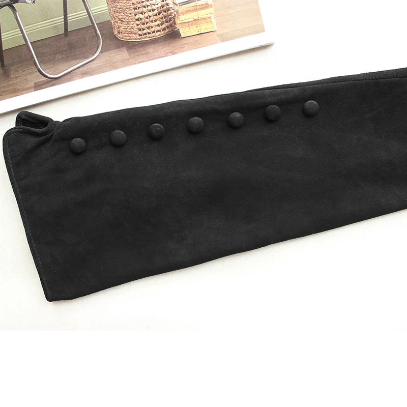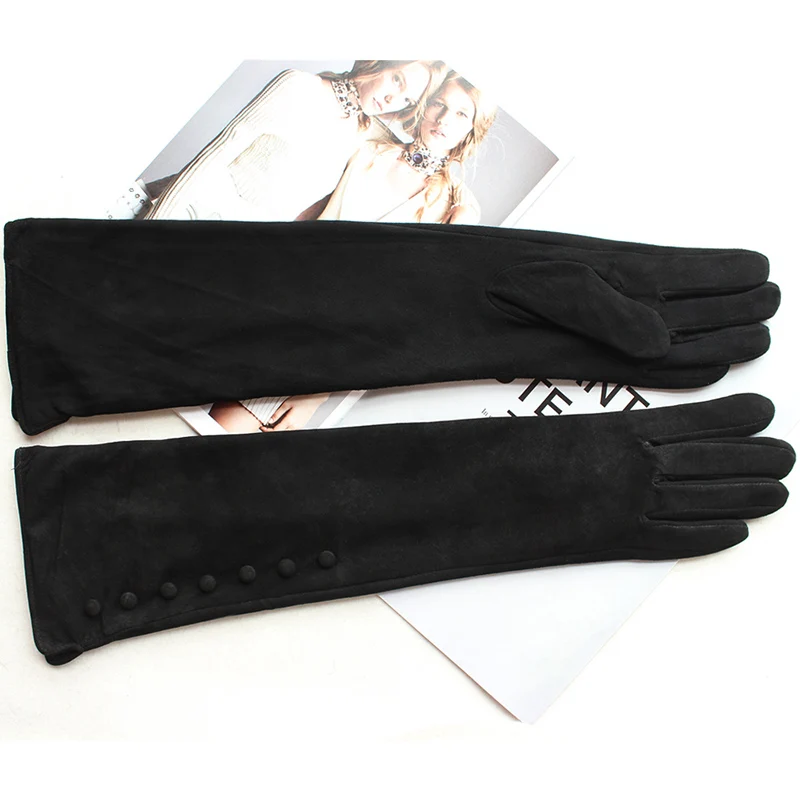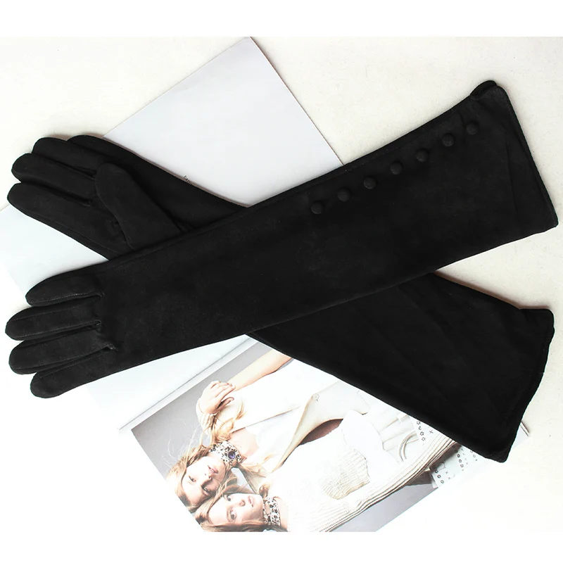 1. Черные длинные перчатки из замши, подходят для ношения с норковым пальто. 2. Два стиля, классический стиль, это высококачественный выбор для подарков. 3. Внутренняя подкладка-бархатная подкладка, которую можно носить, чтобы сохранить тепло зимой.