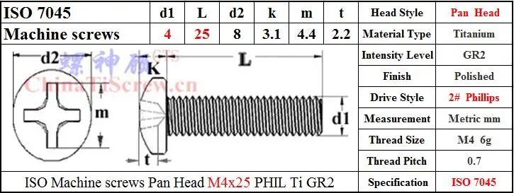 ISO 7045 титановый винт M4x25 головка PHIL Driver Ti GR2 без магнита