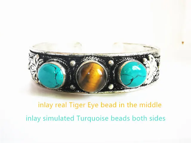 Тибетские Ювелирные изделия Белый Металл Медь инкрустированные бусины браслет Имитация бирюзы тигровый глаз Открытый манжета