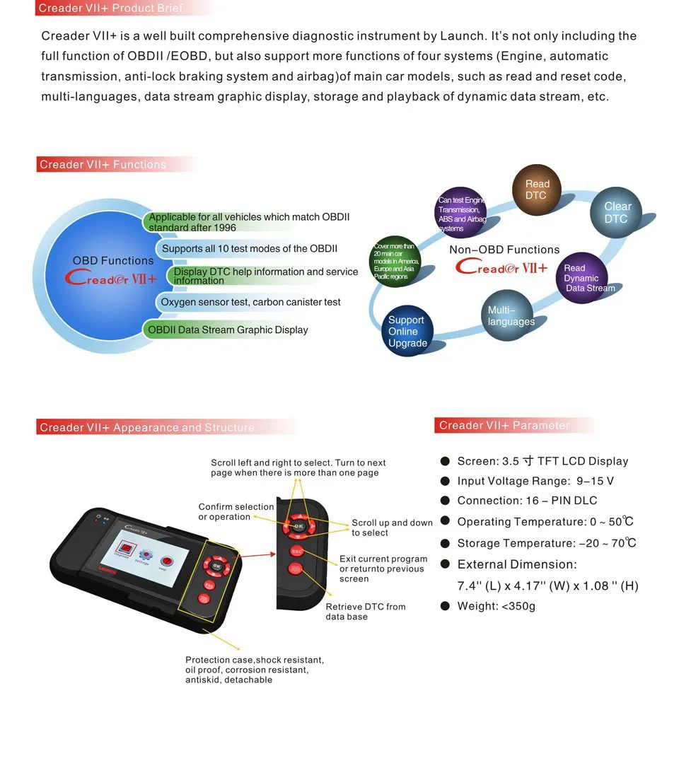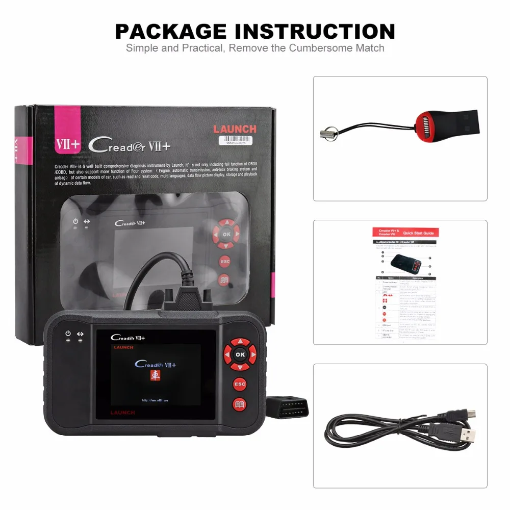 Запуск Creader Профессиональный Creader VII + это новое поколение основной диагностический продукт для профессиональных и отдельных пользователей выпустила старт, Сделай Сам диагностический продукт которого развитие основано на ППН платформа состоит из чип DP431 и JV700 как основные компоненты которые независимо разработан и спроектирован запуска. Основные функции не только включать OBD/EOBD диагностику стандартный протокол, Но также охватывают профессиональное диагностическое программное обеспечение для нескольких моделей, которые могут выполнять полную диагностику на четыре основных ЭБУ (RUS \ abs \ SRS \ AT) транспортного средства. Старт Creader VII + Особенности: 1.3.5 дюймовый цветной tft дисплей, более высокое разрешение, острее цветов 2. Работает на все 1996 и более новый транспортные средства (OBDII и может) 3. получает родовых (P0, P2, P3 и U0), конкретного производителя (P1, P3 и U1), и в ожидании коды 4. Легко determindes причиной Check Двигатели свет 5. выключение mil, очищает коды и сбрасывает мониторов 6. Отображает DTS определений на 320*480 TFT экран corlor 7. views стоп-кадр данных 8. Монитор дисплеев и я/М rediness статус 9. читает жить pcm поток данных 10. Отображает жить O2 датчик Тесты данных 11. Выполняет модули представляют Тесты 12. режим повышенной OBD II 6 13. графики Дисплей, данных запись и воспроизведение и DTCs советы руководство для пользователей первопричины проблемы код быстрее, 14. экономя диагностики и repari время 15. retrieves информация (VIN, CIN и CVN) 16. Поддержка большой карты расширения памяти 17. multilingual меню, DTC определения-английский, испанский и французский, и т. д. 18. чрезвычайно прост в использовании и высоконадежные 19. Интернет обновляемый 20. печать данных с помощью ПК Старт Creader VII + Параметры: Экран: 3.5 дюймов, 320*480 TFT ЖК-дисплей true color дисплей Вход напряжение: 9-18 В Подключение: стандартный 16 контактный obd-диагностический интерфейс Рабочая температура: 0-50 Температура окружающей среды хранения:-20 до 70 Размеры: 136*73*22 (мм) Вес: <350 г
