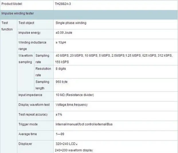 Из-за влияния проволочного материала катушки, магнитного материала, рамок и процесса ремесла и т. Д., катушки продукта (например, трансформатор, двигатель... и т. Д.) может генерировать деподвальные характеристики изоляции слоя катушки, круга и вниз-свинца. TH2882A-3 импульсный тестер обмотки, применяя высокоскоростную технологию выборки для разработки, является новым инструментом для анализа производительности изоляции катушки продукта. Запоминание формы дискретизации стандартной обмотки катушки в приборе внутри, при тестировании TH2882A-3 сравнивает стандартную форму волны и испытанную форму волны в соответствии с критерием настроек (область, дифференциальная область, Коронная разрядка, дифференциальная фаза и т. д.), затем судит, если обмотка катушки хорошая или плохая. Этот инструмент собирает мощную функцию, точный метод тестирования, Гибкий Метод работы и различные интерфейсы, чтобы предложить тестовое решение для большинства заводов намотки катушки. Продукт сохраняет форму образца стандартной обмотки в приборе и сравнивает измеренную форму волны со стандартной во время измерения. Измеренная обмотка будет оцениваться в соответствии с установленным критерием (площадь, разница в площади, разница в фазе, Корона). TH2882A-3 в основном используется для того чтобы измерить трехфазный 3-провод или трехфазный 4-проводной мотор с тремя обмоток. Измеренная Форма волны сравнивается со стандартным в инструменте, или различные формы волны в различных обмотках сравниваются без стандартной формы волны.