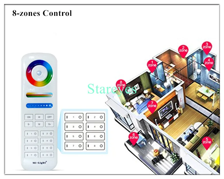 8 зон:1 шт. пульт дистанционного управления 8 шт. контроллера, например: 1 шт. FUT089 может управлять 8 шт. WL5.
