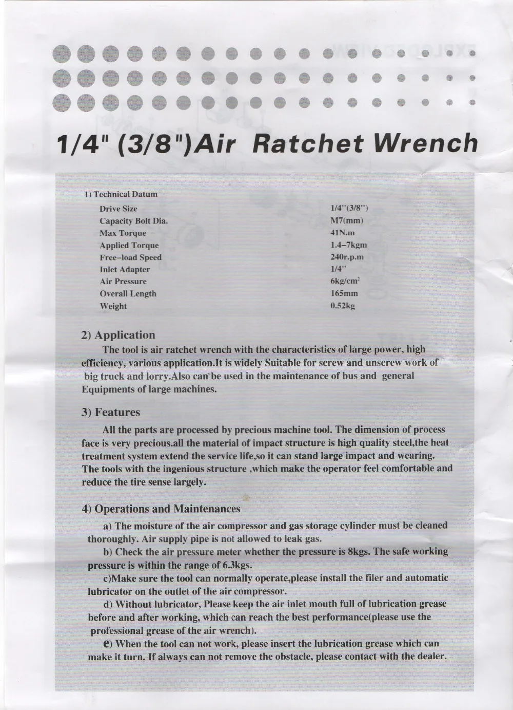 Номер модели : YS-101Квадратный привод: 1/4"Макс. Крутящий момент: 41N.mВибрация с квадратным носком по уровню поверхности: <0,4 ммСвободная скорость: 240 р. М.Давление воздуха: 6 кг/см2Воздушный инет: 1/4"Размер шланга: 3/8"Чистая Вес: 0,6 кгДлина: 165 ммОсобенности:1. Идеально подходит для большинства применений в автомобильной мастерской и подходит для радиатора, свечи зажигания, удаления топлива/водяного насоса.